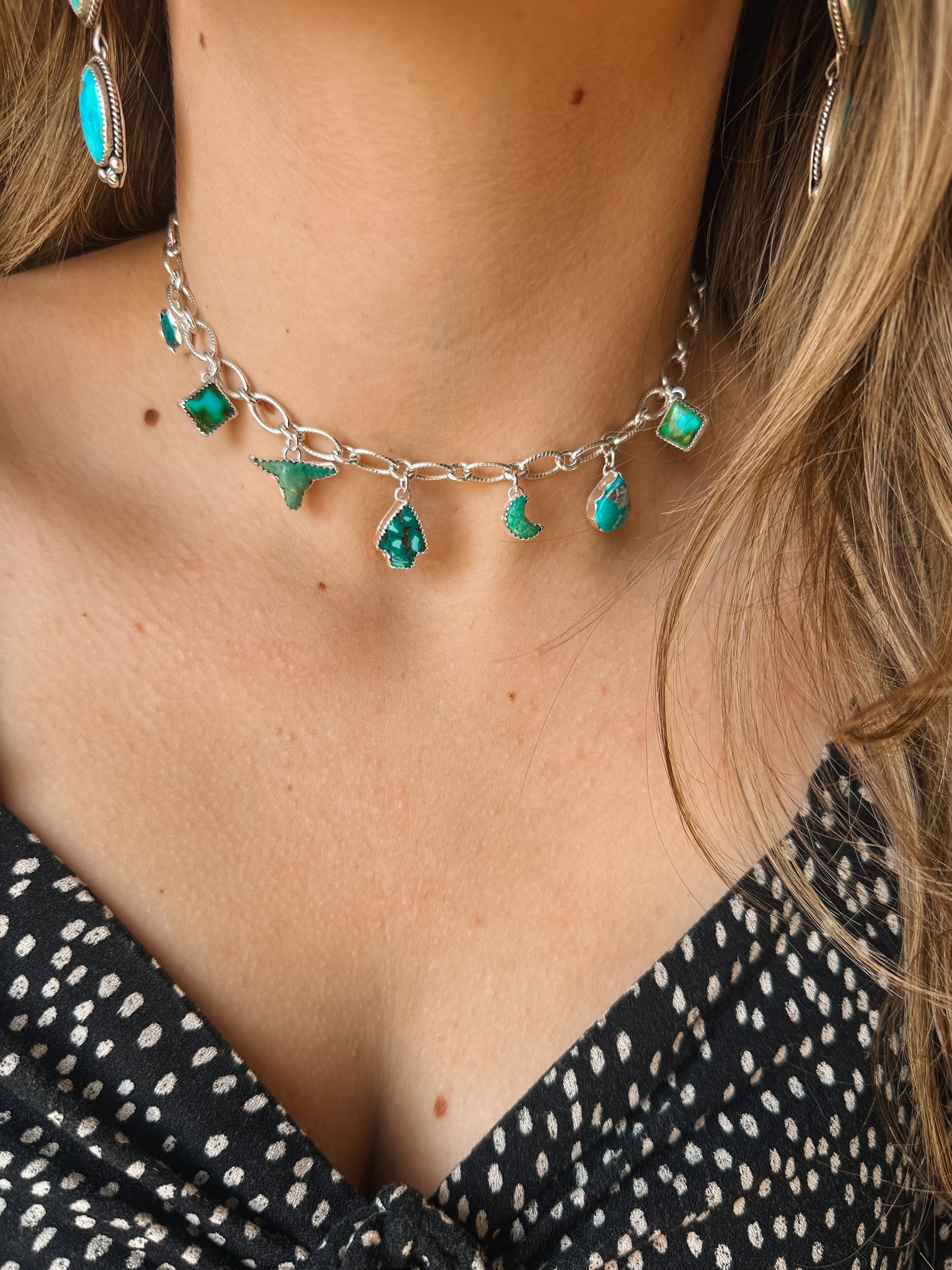 This choker necklace is SO unique and fun!! Featuring 7 different stones including a Kingman Longhorn, Hubei arrowhead, Sonoran squares, and a WhiteWater turquoise teardrop stone.