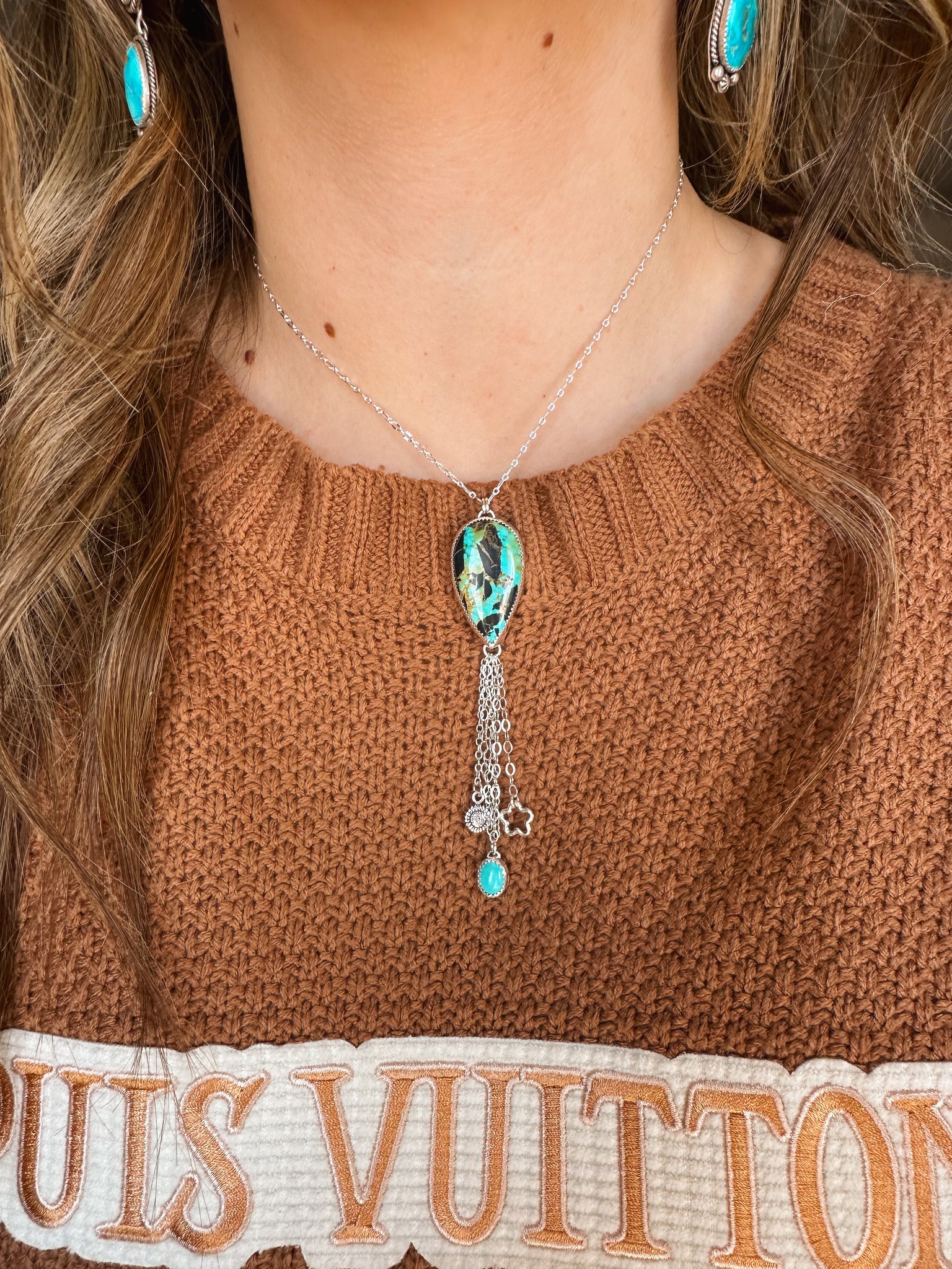 I love how fun and unique this necklace is! A STUNNING Balckjack turquoise stone with sterling chain details and a Kingman stone on the bottom. 16” chain to the Blackjack stone.
