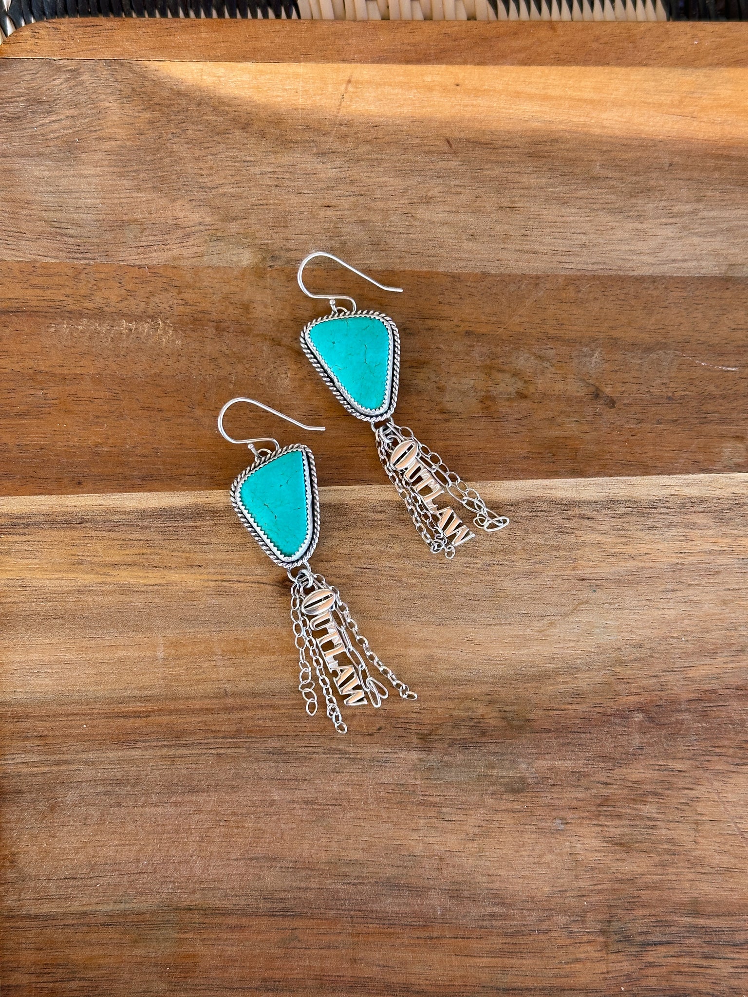 Tyrone turquoise stones with a rope border and the cutest chain accents with the word “OUTLAW”.