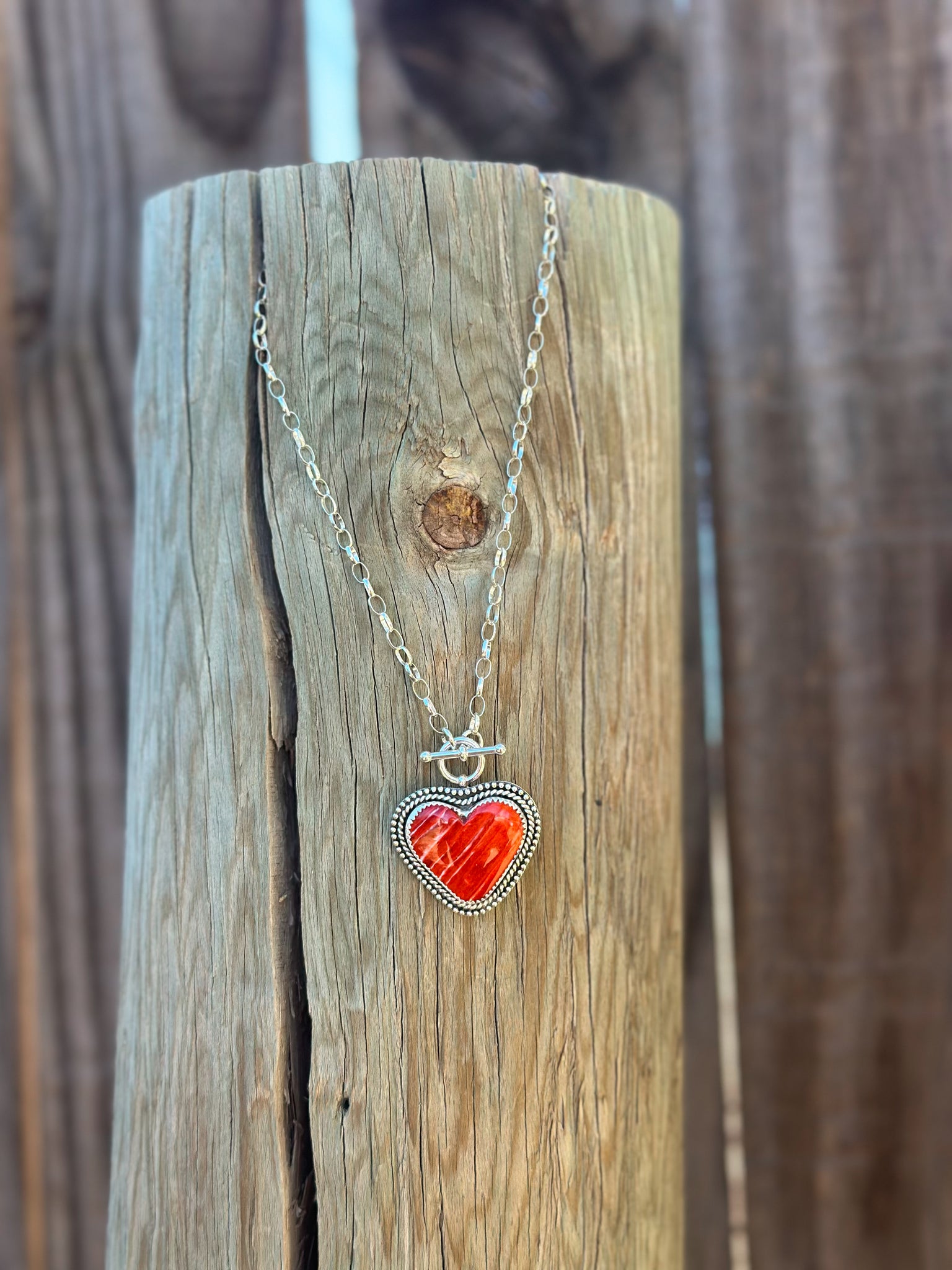 How stunning is this red Spiny Oyster stone?! The border details and toggle chain add some fun detailing. 16” sterling chain