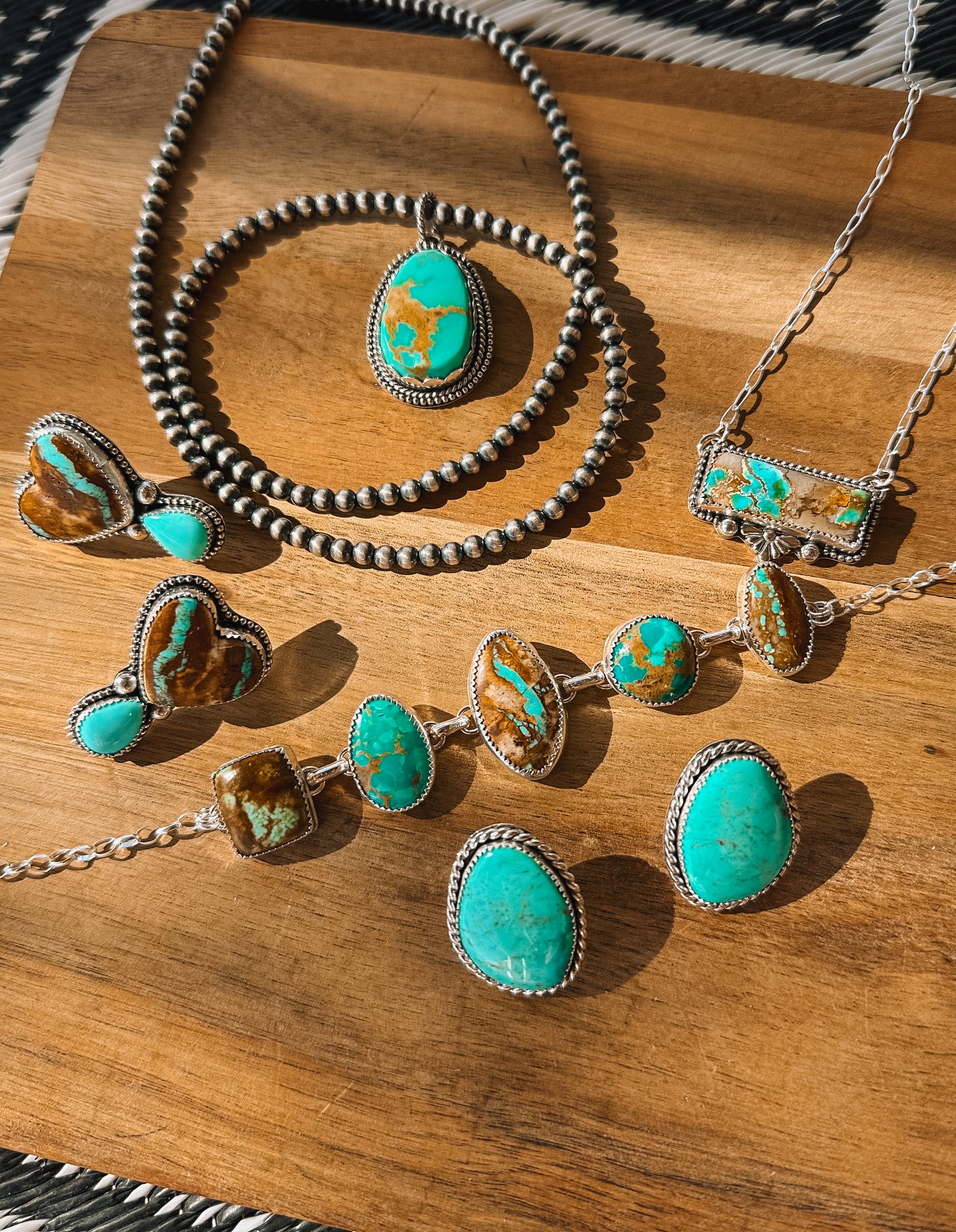 This piece is INSANELY pretty. I guarantee you will get so many compliments wearing it! High grade Thunderbird turquoise paired with Kingman and #8 turquoise. The buyer can choose to have this piece made as either a choker or a bracelet. Either way, this will be a new fav in your jewelry collection!