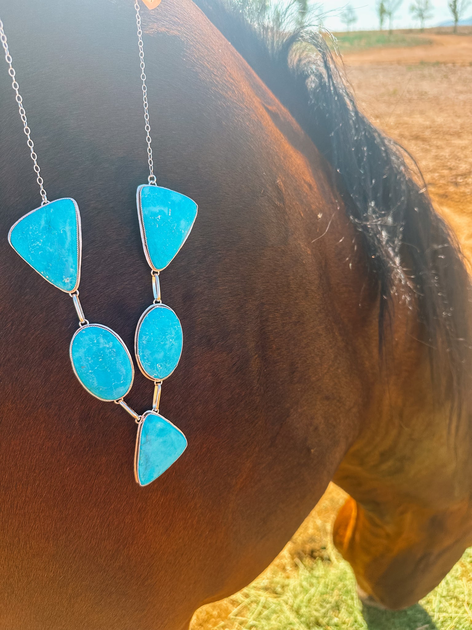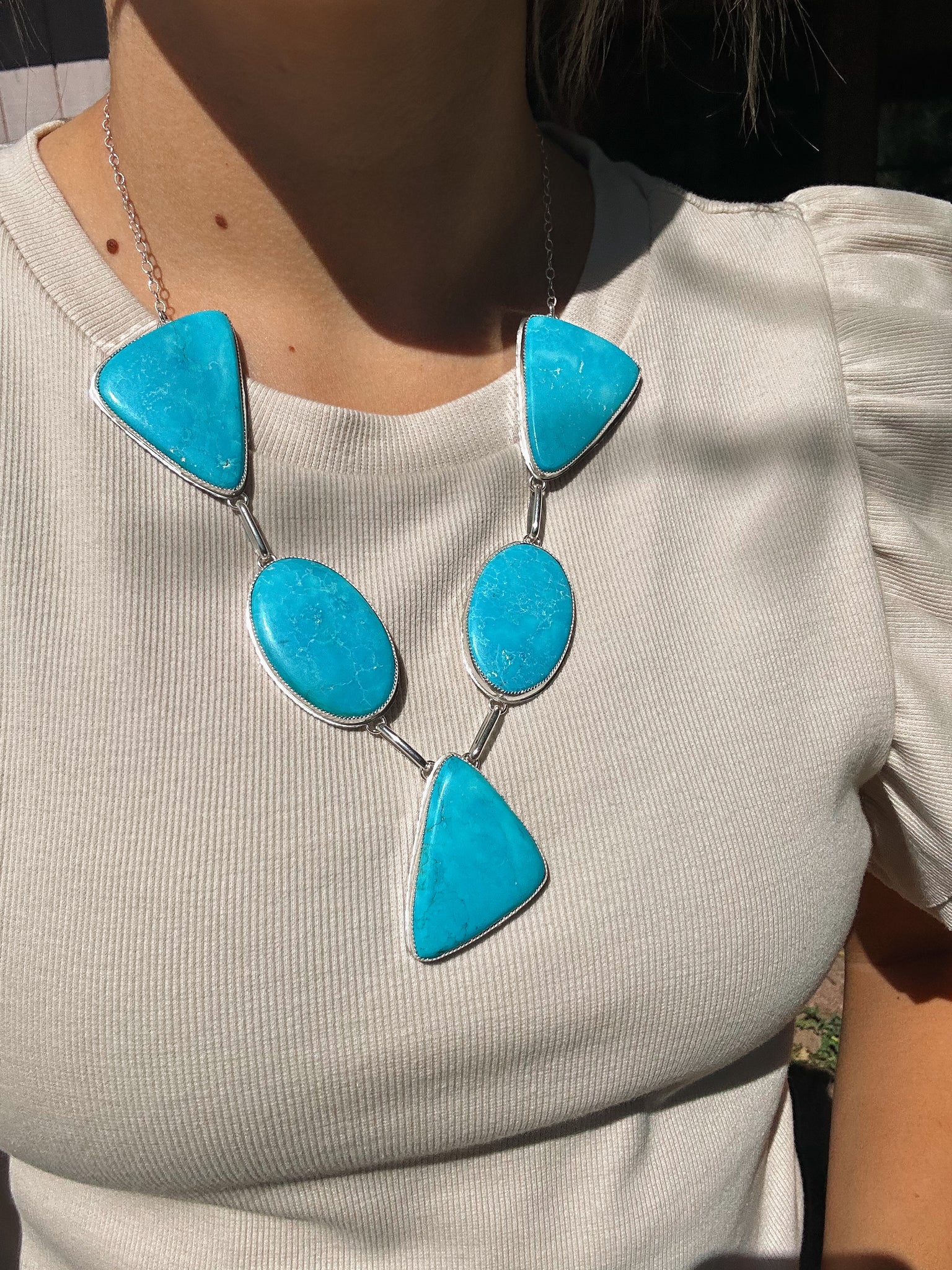 This stunning lariat necklace features some of the biggest turquoise stones I have ever gotten to work with. Huge stones and a big hunk of sterling silver. This piece is one to be handed down to next generations and be worn at the most important events.